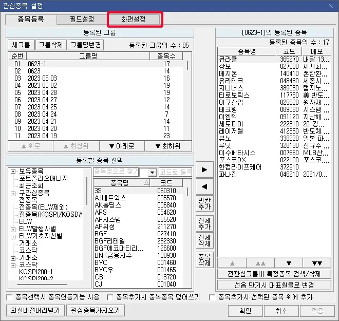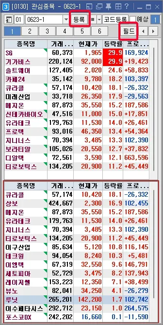 | 키움증권 HTS 영웅문 | 관심종목 0130 다단 설정 방법 | 전광판 만드는 방법 (0) | 2023.06.24 |