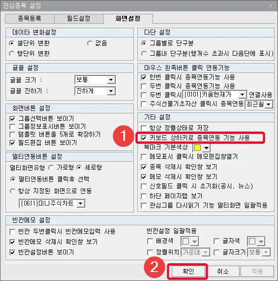 화면설정 - 키보드 상하키로 종목연동 기능 사용