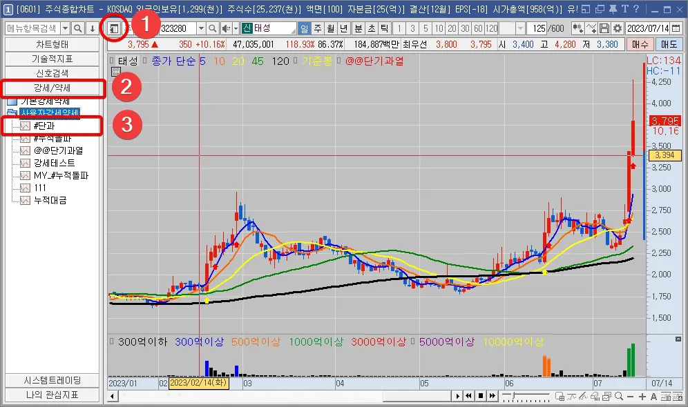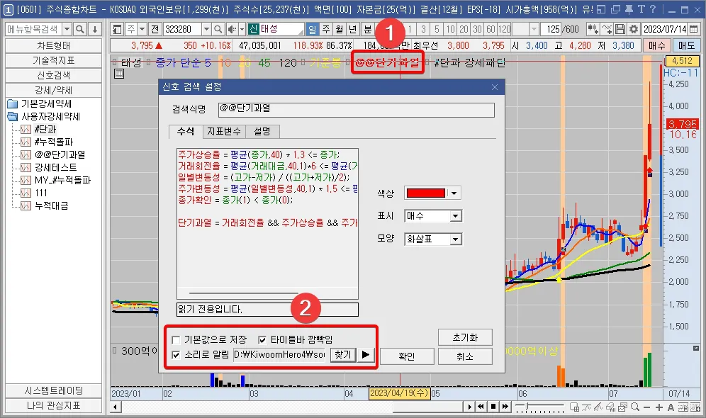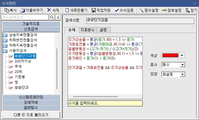 - 단기과열종목 지정예고 수식을 이용한 보조지표 만들기(신호검색, 강세약세)