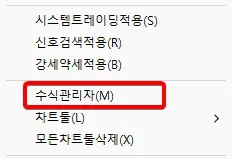 수식관리자에 들어가는 방법은 차트툴바에 있는 [수식관리자] 아이콘을 누르거나, 차트에서 마우스 우클릭하면 나오는 메뉴에 있는 [수식관리자]를 누르시면 됩니다.