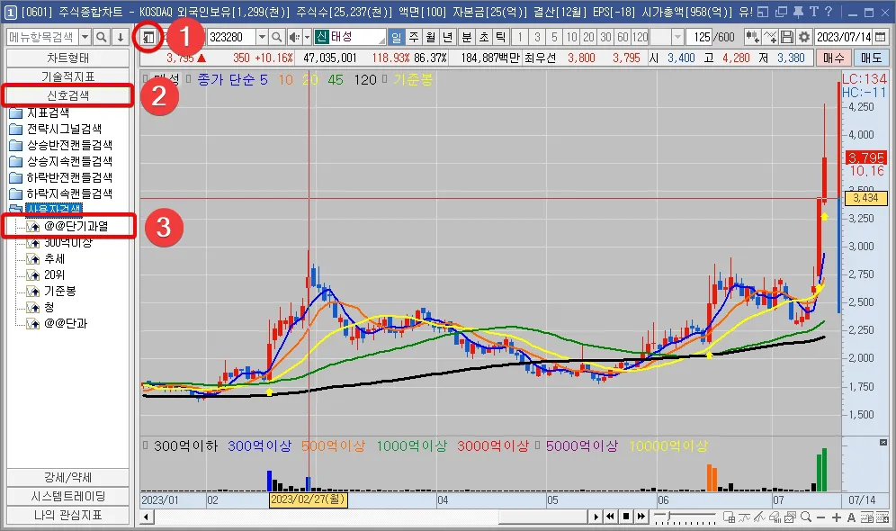 이번 포스팅에서는 키움증권 HTS 영웅문 프로그램의 일봉차트에서 단기과열종목 지정여부를 빠르게 판단할 수 있도록 아래의 내용을 다루도록 하겠습니다.